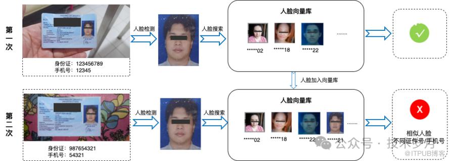 通过在历史人脸数据库中搜索相似的人脸,系统会返回与之相关的历史信息。如果发现历史信息与当前信息不符,例如使用了不同的身份证,则可认定存在欺诈嫌疑。如果未能搜索到相似的人脸,则会将当前人脸及其相关数据存储并累积到数据库中。