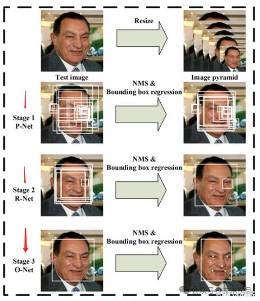 第一阶段,称为P-Net的网络通过浅层卷积神经网络快速生成候选窗口。这一步骤的主要目的是快速筛选出可能包含人脸的区域,确保后续步骤的计算效率。接下来第二阶段,R-Net网络通过更复杂的卷积神经网络进一步处理这些候选窗口,拒绝许多非人脸的边界框。最后,第三阶段的O-Net网络使用更强大的卷积神经网络再次细化结果,并输出五个面部特征点的位置(如眼睛、鼻子和嘴角)。