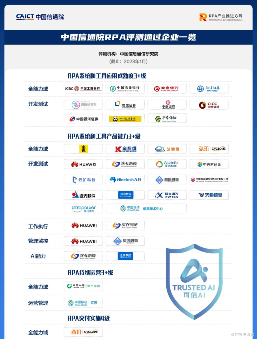 2)RPA持续运营能力评测项目。面向RPA用户开展测试,从RPA项目的管理与运营监控、运营与稳定保障、业绩成果评价等方面分模块开展测试。该项测试将有助于规范RPA运营进程,进一步提升RPA应用成效;