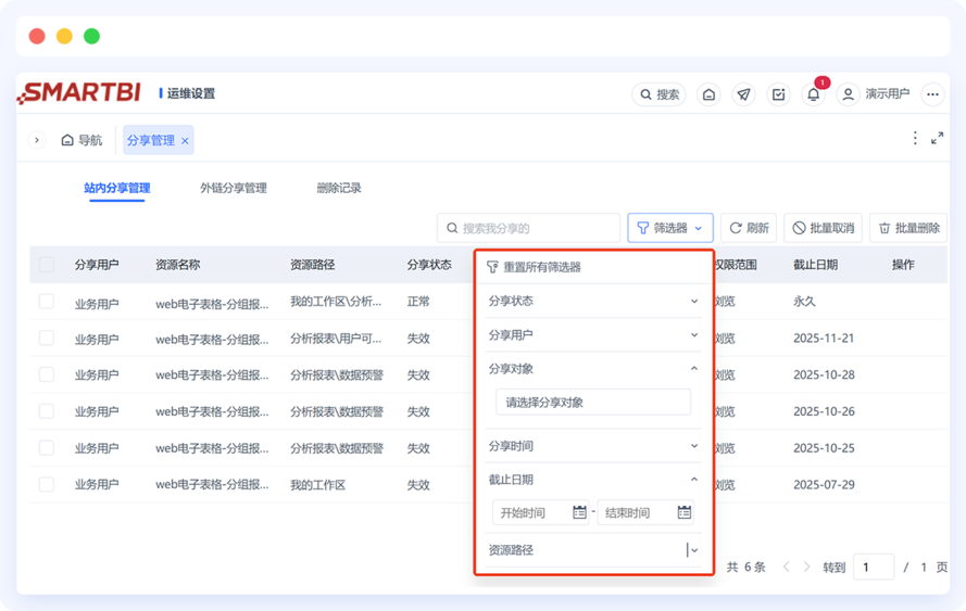 报表分享管理功能进一步优化,新增“分享对象、报表路径、截止时间”等筛选维度,检索更精细效率更高,同时用户可以更快捷地定位与管理历史分享记录。