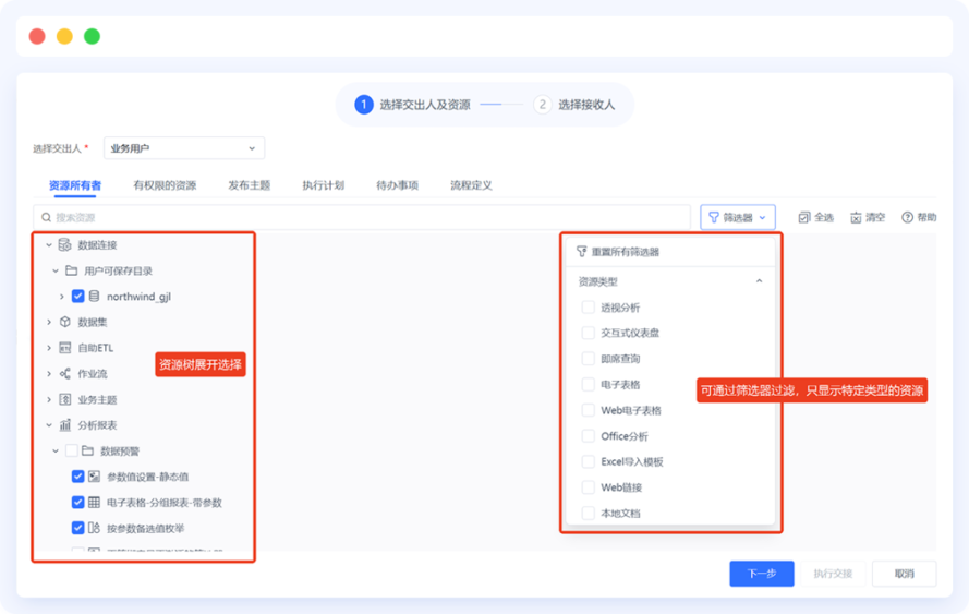 新版本解决了以往人员离职时资源只能“整体打包”的痛点!支持以资源树形式,灵活勾选部分报表或数据集,精准交接给不同的负责人(比如财务报表交接给财务人员,运维、周报等交接给HR运维等)实现更加清晰和精细化的资产交接。