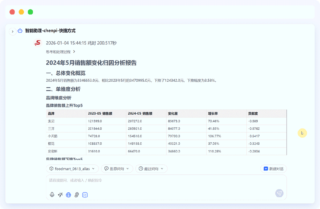 以往重新打开历史会话时,系统无法继承对话上下文,导致分析中断、重复描述。新版本实现上下文关联续问功能,用户可在历史会话中直接延续提问,系统自动识别上一轮对话内容,支持连续、递进式的数据分析,提升交互连贯性与决策效率。