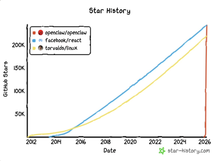 然而,这波AI热潮并未随假期结束而降温——就在最近,一个名为 OpenClaw 的个人AI智能体项目,在短短4个月内于GitHub上掀起风暴,甚至超越了统治Web开发十年之久的底层框架React 。“养龙虾”也成了科技圈大家津津乐道的新黑话。