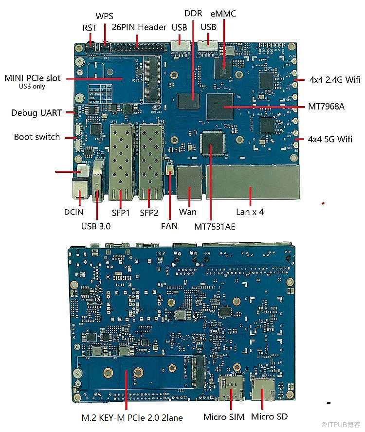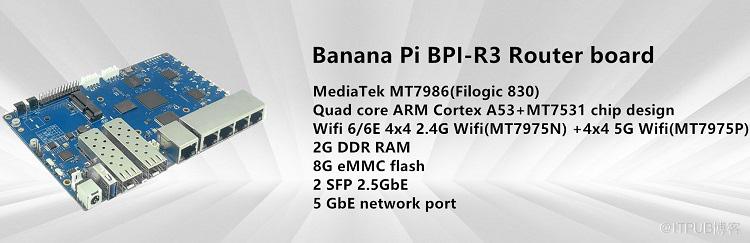 香蕉派BPI-R3开源路由器开发板采用联发科MT7986 (Filogic 830)四核 ARMA53 + MT7531A芯片设计,板载2G DDR内存与8G eMMC存储,这是一个非常高性能开源路由器开发板,支持WIFI 6/6E, 2.4G Wifi无线使用MT7975N芯片, 5G Wifi使用MT7975P芯片,支持2 SFP光通信接口 ,5个千兆网口。