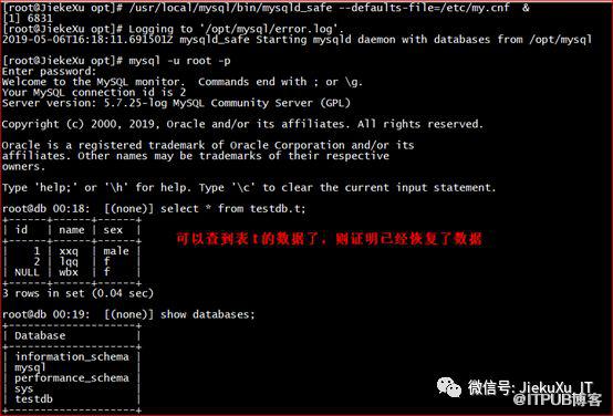 mysqladmin –uroot –proot shutdown ps -ef | grep mysqlmv /opt/mysql /opt/mysql_bakcd /opt/backupmv all_2019-05-09_bak /opt/cd /opt/mv all_2019-05-09_bak/ mysqlchown -R mysql:mysql mysql/usr/local/mysql/bin/mysqld_safe --defaults-file=/etc/my.cnf &mysql -u root -pshow databases;use testdb;select * from t;