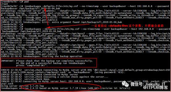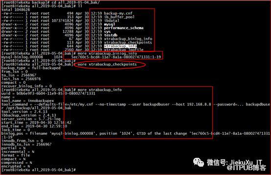 使用此命令便开始备份了,看备份的日志,有开始备份时显示 MySQL 配置信息,提示信息、备份使用账号、版本号、备份工具依赖版本号等等信息。