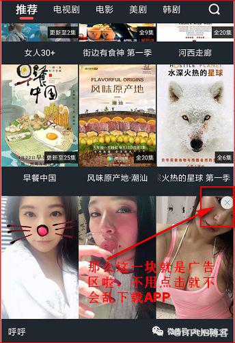 不过,有一点是免费的软件嚒,这个广告是免不了的,打开首页、打开视频时均会出现广告,千万不要点击那个白色圆圈的差号,略过就行了,不然就是各种各样的 APP 下载了,太乱……