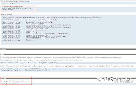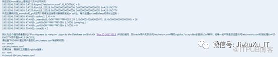 检查此 log 后便定位于此文件 /etc/netsvc.conf ,oracle 用户无权访问 /etc/netsvc.conf 导致 sqlplus / as sysdba 去尝试 LDAP 解析。但唯一的不同是您这里访问 /etc/netsvc.conf 时报的是 Err#25 ENOTTY 而不是 Err#13 EACCES。检查下 RDBMS 属主用户是否对 /etc/netsvc.conf 有读取权限,是否为 664 权限,使用 oracle 用户查看有访问权限,权限无问题,并给出参考文档 SQL*Plus Appears to Hang on Logon to the Database on IBM AIX (文档 ID 2017323.1)
