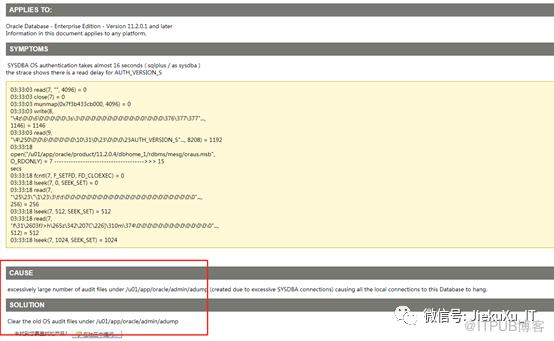 首先想到的是不是由于审计目录过大的原因,因为 sqlplus / as sysdba 使用的是操作系统鉴权,猜想在进行审计是写入过慢导致,但去查看相关的目录均不到 1G 大小,这种问题也无法通过其他类似 AWR 报告的东西查看。所以也想不到更好的办法了,便只能去寻找帮助了,咨询了一圈同事后无果,便灰溜溜的去 MOS 提 SR 了。