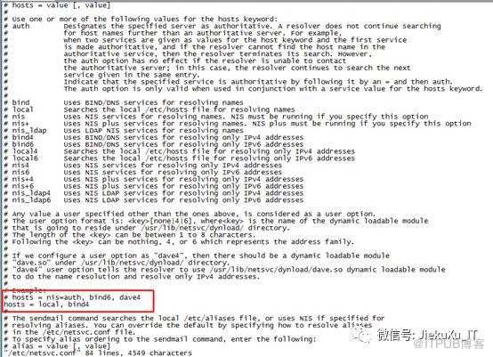 netsvc.conf File:该 /etc/netsvc.conf 中的文件是用来指定名称解析的顺序为sendmail 的命令,调用 gethostbyname 子程序,gethostaddr 子程序和gethostent 子程序和别名分辨率的 sendmail 的命令。有几种用于解析主机名和别名的机制。在调用 gethostbyname,gethostbyaddr 和 gethostent 子程序使用这些机制的解析名称。存在默认顺序,其中解析程序子例程尝试使用解析主机名和Internet 协议(IP)地址的机制。