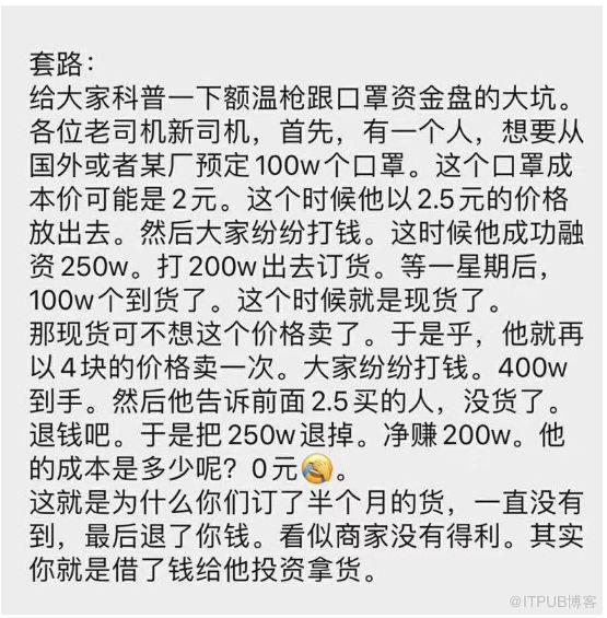疫情当下,每个人都应该力所能及的贡献自己的力量,在这个供需不平衡的时候,买的东西稍微贵那么一点点是可以接受的,但也不能坐地起价贵的让人吃惊,更甚是还有一部分人卖的是假货,过期的货品,这就着实让人可恶。国家虽严厉打击此等事情发生,但实在太多了,前天在一知识星球内看到一消息也让我很是吃惊。。。
