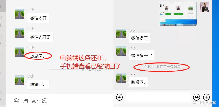 再来看登录以后发布的消息,手机端查看已经撤回了,但 PC 端还存在,什么意思呢?就是你女友给你发消息时明明已经撤回了,还以为只有自己知道,殊不知,你的 PC 端还是显示她撤回的消息的,但手机端确实是已经撤回了,这就是这款软件的强大之处了。