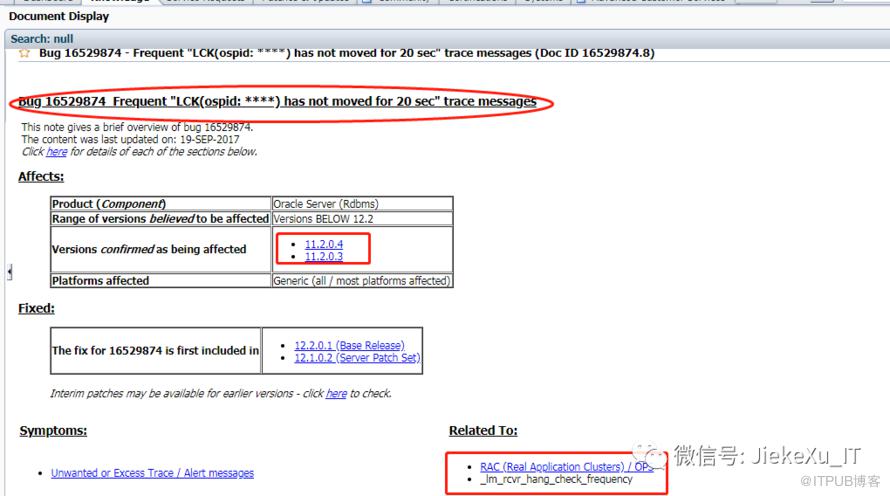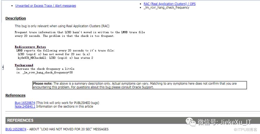 Bug 16529874 - Frequent "LCK(ospid: ****) has not moved for 20 sec" trace messages (Doc ID 16529874.8) 果然就是 Bug,12.2 以下版本均会受影响,Bug 16529874 在 12c 中才修复了,文档中提到一参数 “ _lm_rcvr_hang_check_frequency” 这个以下划线开头的为隐含参数,需要修改此参数。