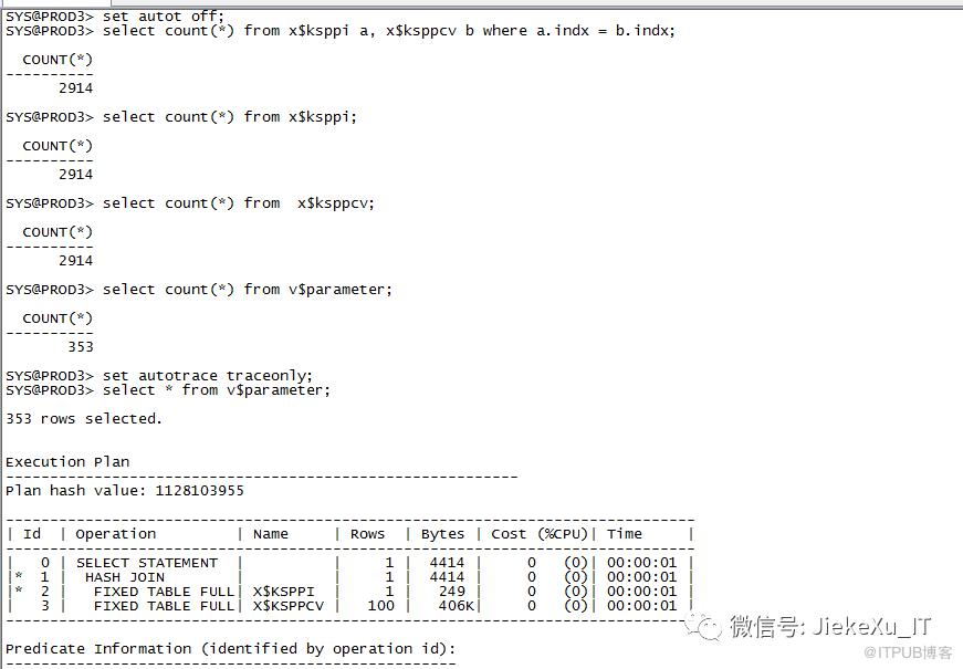 SYS@PROD3> set autotrace traceonly;SYS@PROD3> select * from v$parameter;353 rows selected.Execution Plan----------------------------------------------------------Plan hash value: 1128103955------------------------------------------------------------------------------| Id | Operation | Name | Rows | Bytes | Cost (%CPU)| Time |------------------------------------------------------------------------------| 0 | SELECT STATEMENT | | 1 | 4414 | 0 (0)| 00:00:01 ||* 1 | HASH JOIN | | 1 | 4414 | 0 (0)| 00:00:01 ||* 2 | FIXED TABLE FULL| X$KSPPI | 1 | 249 | 0 (0)| 00:00:01 || 3 | FIXED TABLE FULL| X$KSPPCV | 100 | 406K| 0 (0)| 00:00:01 |------------------------------------------------------------------------------Predicate Information (identified by operation id):---------------------------------------------------1 - access("X"."INDX"="Y"."INDX")filter(TRANSLATE("KSPPINM",'_','#') NOT LIKE '#%' OR"KSPPSTDF"='FALSE' OR BITAND("KSPPSTVF",5)>0)2 - filter("X"."INST_ID"=USERENV('INSTANCE') ANDBITAND("KSPPIFLG",268435456)=0 AND TRANSLATE("KSPPINM",'_','#') NOTLIKE '##%')Statistics----------------------------------------------------------5 recursive calls0 db block gets8 consistent gets0 physical reads0 redo size38903 bytes sent via SQL*Net to client772 bytes received via SQL*Net from client25 SQL*Net roundtrips to/from client0 sorts (memory)0 sorts (disk)352 rows processedSYS@PROD3> set line 80SYS@PROD3> desc x$ksppiName Null? Type----------------------------------------- -------- ----------------------------ADDR RAW(8) --内存地址INDX NUMBER --序号,从0开始INST_ID NUMBER --instance numberKSPPINM VARCHAR2(80) --参数名称KSPPITY NUMBER --参数类型 1,'boolean' 2,'string', 3,'number',4,'fileKSPPDESC VARCHAR2(255) --描述KSPPIFLG NUMBER --标志字段(用来说明是isses_modifiable or issys_modifiableKSPPILRMFLG NUMBERKSPPIHASH NUMBERSYS@PROD3> desc x$ksppcvName Null? Type----------------------------------------- -------- ----------------------------ADDR RAW(8) --内存地址INDX NUMBER --序号,从0开始INST_ID NUMBER --instance numberKSPPSTVL VARCHAR2(4000) --当前值KSPPSTDVL VARCHAR2(4000)KSPPSTDF VARCHAR2(9) --是否为缺省值KSPPSTVF NUMBER --标志字段,用来说明('Modified' or 'System Modified' or is_adjusted)KSPPSTCMNT VARCHAR2(255) --comment