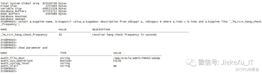 sqlplus / as sysdbaSQL> set line 345col host_name for a30select inst_id,INSTANCE_NAME,HOST_name,status from gv$instance;SQL> INST_ID INSTANCE_NAME HOST_NAME STATUS---------- -------------------------------- ------------------------------ ------------------------ 1 testdbs1 JiekeXu1 OPEN 2 testdbs2 JiekeXu2 OPENSQL> show parameter audit_trailNAME TYPE VALUE------------------------------------ ---------------------- ------------------------------audit_trail string NONESQL> exit--顺便看了眼 LCK0 和 LMHB 这两个后台进程JiekeXu1:/app/oracle/diag/rdbms/testdbs/testdbs1/trace$ps -ef | grep ora_lck0 oracle 12386998 1 9 16:48:18 - 3:38 ora_lck0_testdbs1 oracle 12060336 35521284 0 20:56:14 pts/3 0:00 grep ora_lck0JiekeXu1:/app/oracle/diag/rdbms/testdbs/testdbs1/trace$ps -ef | grep ora_lmhb oracle 8323226 1 0 16:48:06 - 0:00 ora_lmhb_testdbs1 oracle 25560564 35521284 0 20:56:41 pts/3 0:00 grep ora_lmhb