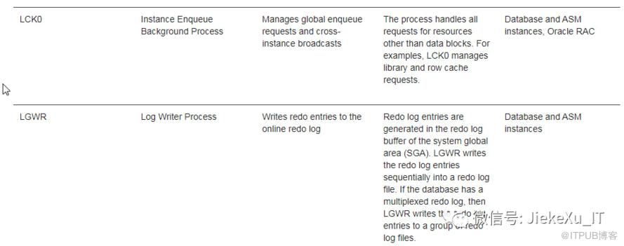 LCK0Instance Enqueue Background ProcessManages global enqueue requests and cross-instance broadcastsThe process handles all requests for resources other than data blocks. For examples, LCK0 manages library and row cache requests.Database and ASM instances, Oracle RAC--下面是 LMHB 进程解释,LMHB 监视 LMON、LMD 和 LMSn 进程,以确保它们在没有阻塞或旋转的情况下正常运行。LMHBGlobal Cache/Enqueue Service Heartbeat MonitorMonitor the heartbeat of LMON, LMD, and LMSn processesLMHB monitors LMON, LMD, and LMSn processes to ensure they are running normally without blocking or spinning.Database and ASM instances, Oracle RAC