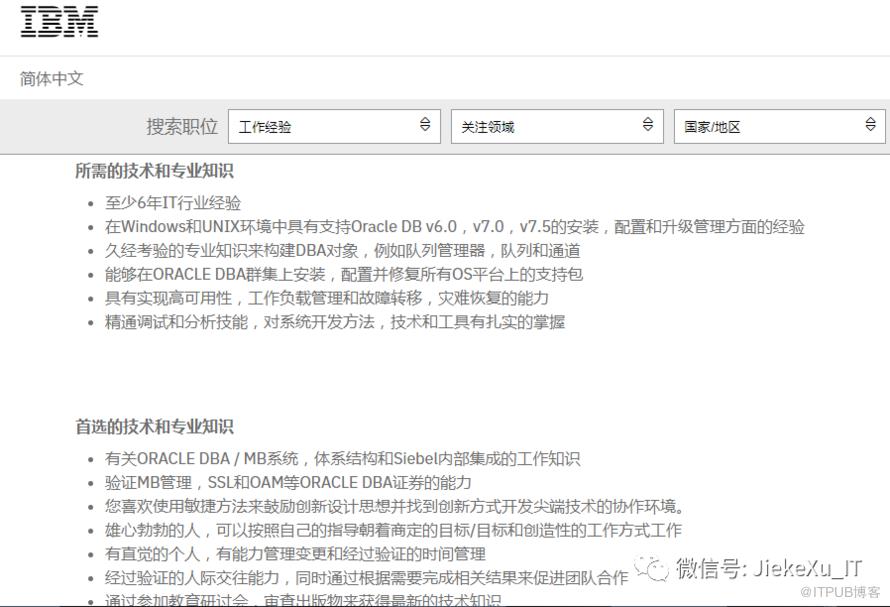 下边是 IBM 的 DBA 招聘要求,看看符合要求不?但是这要求 Oracle DB v6.0,v7.0,v7.5 的安装,这信息得是多少年没有修改了啊,看看就好吧,继续了。