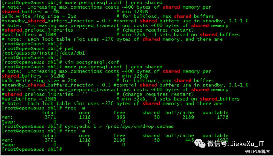 [root@openGauss db1]# more postgresql.conf | grep shared# Note: Increasing max_connections costs ~400 bytes of shared memory pershared_buffers = 256MB # min 128kBbulk_write_ring_size = 2GB # for bulkload, max shared_buffers#standby_shared_buffers_fraction = 0.3 #control shared buffers use in standby, 0.1-1.0# Note: Increasing max_prepared_transactions costs ~600 bytes of shared memory#shared_preload_libraries = '' # (change requires restart)#wal_buffers = 16MB # min 32kB, -1 sets based on shared_buffers# Note: Each lock table slot uses ~270 bytes of shared memory, and there are[omm@openGauss ~]$ gs_ctl start -D /opt/gaussdb/install/data/db1[2020-07-12 00:34:08.675][65571][][gs_ctl]: gs_ctl started,datadir is -D "/opt/gaussdb/install/data/db1"[2020-07-12 00:34:08.837][65571][][gs_ctl]: waiting for server to start....0 [BACKEND] LOG: Begin to start openGauss Database.2020-07-12 00:34:09.095 5f09ea00.1 [unknown] 140315229097728 [unknown] 0 dn_6001 DB001 0 [REDO] LOG: Recovery parallelism, cpu count = 4, max = 4, actual = 42020-07-12 00:34:09.095 5f09ea00.1 [unknown] 140315229097728 [unknown] 0 dn_6001 DB001 0 [REDO] LOG: ConfigRecoveryParallelism, true_max_recovery_parallelism:4, max_recovery_parallelism:42020-07-12 00:34:09.095 5f09ea00.1 [unknown] 140315229097728 [unknown] 0 dn_6001 00000 0 [BACKEND] LOG: gaussdb.state does not exist, and skipt setting since it is optional.2020-07-12 00:34:09.095 5f09ea00.1 [unknown] 140315229097728 [unknown] 0 dn_6001 00000 0 [BACKEND] LOG: Transparent encryption disabled.2020-07-12 00:34:09.136 5f09ea00.1 [unknown] 140315229097728 [unknown] 0 dn_6001 01000 0 [BACKEND] WARNING: could not create any HA TCP/IP sockets2020-07-12 00:34:09.148 5f09ea00.1 [unknown] 140315229097728 [unknown] 0 dn_6001 00000 0 [BACKEND] LOG: InitNuma numaNodeNum: 1 numa_distribute_mode: none inheritThreadPool: 0.2020-07-12 00:34:09.148 5f09ea00.1 [unknown] 140315229097728 [unknown] 0 dn_6001 01000 0 [BACKEND] WARNING: Failed to initialize the memory protect for g_instance.attr.attr_storage.cstore_buffers (1024 Mbytes) or shared memory (1876 Mbytes) is larger.2020-07-12 00:34:09.361 5f09ea00.1 [unknown] 140315229097728 [unknown] 0 dn_6001 00000 0 [CACHE] LOG: set data cache size(805306368)2020-07-12 00:34:09.488 5f09ea00.1 [unknown] 140315229097728 [unknown] 0 dn_6001 00000 0 [CACHE] LOG: set metadata cache size(268435456)2020-07-12 00:34:10.841 5f09ea00.1 [unknown] 140315229097728 [unknown] 0 dn_6001 00000 0 [BACKEND] LOG: gaussdb: fsync file "/opt/gaussdb/install/data/db1/gaussdb.state.temp" success2020-07-12 00:34:10.841 5f09ea00.1 [unknown] 140315229097728 [unknown] 0 dn_6001 00000 0 [BACKEND] LOG: create gaussdb state file success: db state(STARTING_STATE), server mode(Normal)2020-07-12 00:34:10.868 5f09ea00.1 [unknown] 140315229097728 [unknown] 0 dn_6001 00000 0 [BACKEND] LOG: max_safe_fds = 978, usable_fds = 1000, already_open = 122020-07-12 00:34:10.871 5f09ea00.1 [unknown] 140315229097728 [unknown] 0 dn_6001 00000 0 [BACKEND] LOG: user configure file is not found, it will be created.2020-07-12 00:34:10.900 5f09ea00.1 [unknown] 140315229097728 [unknown] 0 dn_6001 00000 0 [BACKEND] LOG: Success to start openGauss Database, please press any key to exit....[2020-07-12 00:34:12.107][65571][][gs_ctl]: done[2020-07-12 00:34:12.107][65571][][gs_ctl]: server started (/opt/gaussdb/install/data/db1)[omm@openGauss ~]$###----如上算是启动成功了