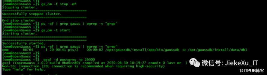 [omm@openGauss ~]$ gs_om -t stop -mfStopping cluster.=========================================Successfully stopped cluster.=========================================End stop cluster.[omm@openGauss ~]$ ps -ef | grep gauss | egrep -v "grep"[omm@openGauss ~]$[omm@openGauss ~]$ gs_om -t startStarting cluster.==================================================================================Successfully started.[omm@openGauss ~]$ ps -ef | grep gauss | egrep -v "grep"omm 66764 1 20 00:41 pts/2 00:00:02 /opt/gaussdb/install/app/bin/gaussdb -D /opt/gaussdb/install/data/db1[omm@openGauss ~]$ gsql -d postgres -p 26000gsql ((openGauss 1.0.0 build 0bd0ce80) compiled at 2020-06-30 18:19:27 commit 0 last mr )Non-SSL connection (SSL connection is recommended when requiring high-security)Type "help" for help.--使用 “gs_om -t status –detail” 命令查询 openGauss 各实例情况。[omm@openGauss ~]$ gs_om -t status --detail[ Cluster State ]cluster_state : Normalredistributing : Nocurrent_az : AZ_ALL[ Datanode State ]node node_ip instance state---------------------------------------------------------------------------------------1 openGauss 192.168.52.88 6001 /opt/gaussdb/install/data/db1 P Primary Normal