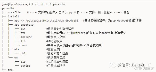 [omm@openGauss ~]$ tree -d -L 3 gaussdb/gaussdb/├── corefile # core 文件存放目录,类似于 pg 中的 core 文件,用于数据库 crash 追踪├── install│ ├── app -> /opt/gaussdb/install/app_0bd0ce80 #数据库安装路径,为app_0bd0ce80的软连接│ ├── app_0bd0ce80│ │ ├── bin #数据库命令执行路径│ │ ├── etc #数据库配置路径(如kerberos路径和云上obs映射区域配置)│ │ ├── include #数据库头文件│ │ ├── lib #动态链接库│ │ └──share #共享目录库(包括pg扩展和ssl根证书文件)│ ├──data #数据目录│ │ └── db1 #数据库文件目录│ └── om #运维管理目录│ ├── lib #执行脚本使用库│ └── script #工具脚本路径└── tmp