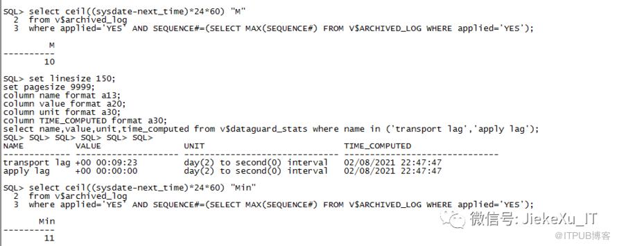 select ceil((sysdate-next_time)*24*60) "M" from v$archived_log where applied='YES' AND SEQUENCE#=(SELECT MAX(SEQUENCE#) FROM V$ARCHIVED_LOG WHERE applied='YES');