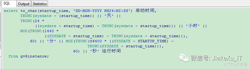 select to_char(startup_time,'DD-MON-YYYY HH24:MI:SS') 启动时间,TRUNC(sysdate-(startup_time))||'天'||TRUNC(24*((sysdate-startup_time)-TRUNC(sysdate-startup_time)))||'小时'||MOD(TRUNC(1440*((SYSDATE-startup_time)-TRUNC(sysdate-startup_time))),60)||'分'||MOD(TRUNC(86400*((SYSDATE-STARTUP_TIME)-TRUNC(SYSDATE-startup_time))),60)||'秒' 运行时间from gv$instance;