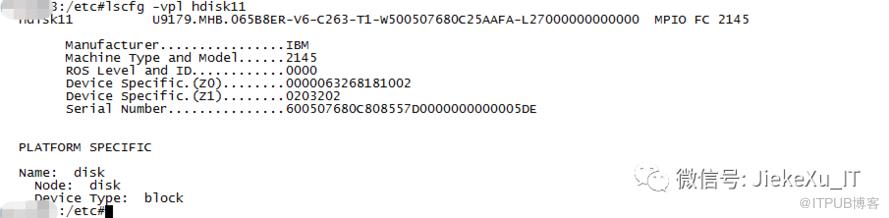 prtconf|morelparstat -iortconfAIX 磁盘扫描命令root 执行cfgmgr -v--查看那个进程占用磁盘空间fuser -dV /appAIX 查看错误日志并输出到 messagesJIekeXuY1:/#errpt -dHIDENTIFIER TIMESTAMP T C RESOURCE_NAME DESCRIPTIONDE3B8540 1012214419 P H hdisk18 PATH HAS FAILED4B436A3D 1012214119 T H fscsi0 LINK ERROR4B436A3D 1012214119 T H fscsi0 LINK ERROR4B436A3D 1012214119 T H fscsi0 LINK ERROR-a > messages.outAIX查看LUNID信息lscfg -vpl hdisk187 输出结果里的 serial number就是存储要的lunid# lscfg -vpl hdisk11hdisk11 U9080.MME.680A6E8-V7-C2-T1-W500507680C25ADBA-LB000000000000 MPIO FC 2145Machine Type and Model......2145ROS Level and ID............0000Device Specific.(Z0)........0000063268181002Device Specific.(Z1)........0203202Serial Number...............600507680C808570080000000000042BPLATFORM SPECIFICName: diskNode: disk: block