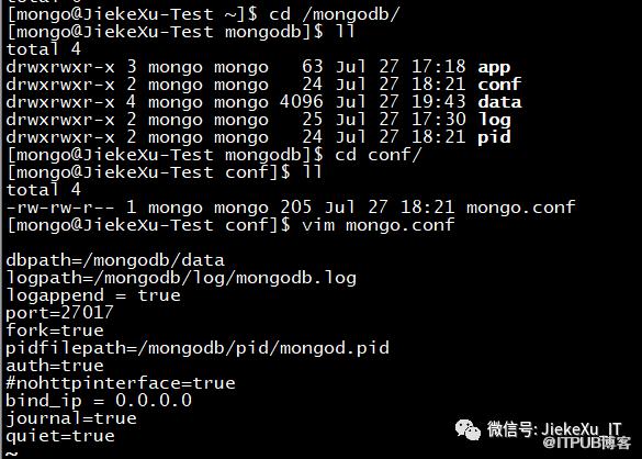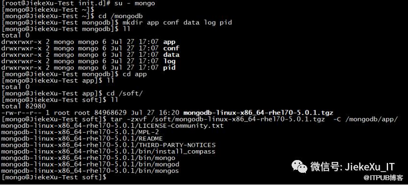 # mkdir /mongodb# chown -R mongo:mongo /mongodb# su - mongo$ cd /mongodb$ mkdir app conf data log pid[mongo@JiekeXu-Test mongodb]$ lltotal 0drwxrwxr-x 2 mongo mongo 6 Jul 27 17:07 appdrwxrwxr-x 2 mongo mongo 6 Jul 27 17:07 confdrwxrwxr-x 2 mongo mongo 6 Jul 27 17:07 datadrwxrwxr-x 2 mongo mongo 6 Jul 27 17:07 logdrwxrwxr-x 2 mongo mongo 6 Jul 27 17:07 pid[mongo@JiekeXu-Test mongodb]$ cd app[mongo@JiekeXu-Test app]$ lltotal 0[mongo@JiekeXu-Test app]$ cd /soft/[mongo@JiekeXu-Test soft]$ lltotal 82980-rw-r--r-- 1 root root 84968629 Jul 27 16:20 mongodb-linux-x86_64-rhel70-5.0.1.tgz[mongo@JiekeXu-Test soft]$ tar -zxvf /soft/mongodb-linux-x86_64-rhel70-5.0.1.tgz -C /mongodb/app/mongodb-linux-x86_64-rhel70-5.0.1/LICENSE-Community.txtmongodb-linux-x86_64-rhel70-5.0.1/MPL-2mongodb-linux-x86_64-rhel70-5.0.1/READMEmongodb-linux-x86_64-rhel70-5.0.1/THIRD-PARTY-NOTICESmongodb-linux-x86_64-rhel70-5.0.1/bin/install_compassmongodb-linux-x86_64-rhel70-5.0.1/bin/mongomongodb-linux-x86_64-rhel70-5.0.1/bin/mongodmongodb-linux-x86_64-rhel70-5.0.1/bin/mongos