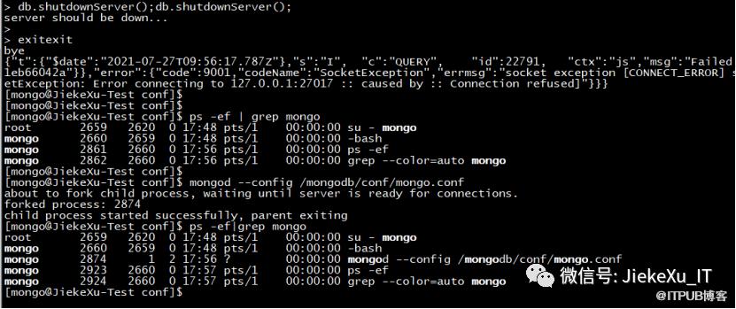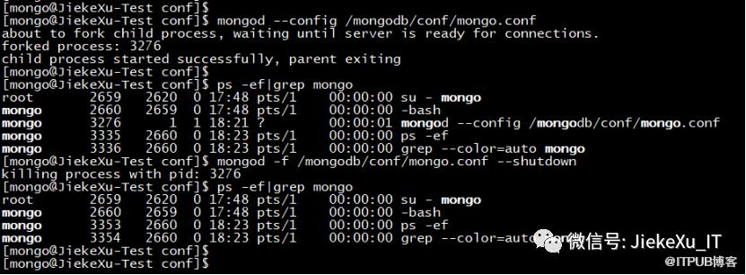 [mongo@JiekeXu-Test conf]$ mongod --config /mongodb/conf/mongo.confabout to fork child process, waiting until server is ready for connections.forked process: 3276child process started successfully, parent exiting[mongo@JiekeXu-Test conf]$[mongo@JiekeXu-Test conf]$ ps -ef|grep mongoroot 2659 2620 0 17:48 pts/1 00:00:00 su - mongomongo 2660 2659 0 17:48 pts/1 00:00:00 -bashmongo 3276 1 1 18:21 ? 00:00:01 mongod --config /mongodb/conf/mongo.confmongo 3335 2660 0 18:23 pts/1 00:00:00 ps -efmongo 3336 2660 0 18:23 pts/1 00:00:00 grep --color=auto mongo[mongo@JiekeXu-Test conf]$ mongod -f /mongodb/conf/mongo.conf --shutdownkilling process with pid: 3276[mongo@JiekeXu-Test conf]$ ps -ef|grep mongoroot 2659 2620 0 17:48 pts/1 00:00:00 su - mongomongo 2660 2659 0 17:48 pts/1 00:00:00 -bashmongo 3353 2660 0 18:23 pts/1 00:00:00 ps -efmongo 3354 2660 0 18:23 pts/1 00:00:00 grep --color=auto mongo