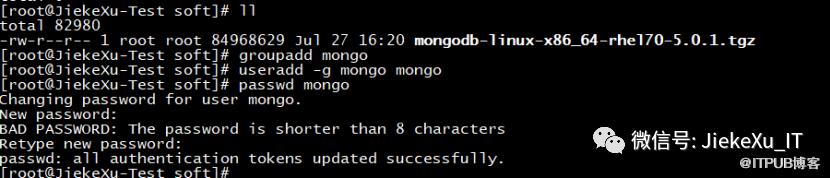 [root@JiekeXu-Test /]# mkdir -p /soft[root@JiekeXu-Test /]# cd soft[root@JiekeXu-Test soft]# lltotal 0[root@JiekeXu-Test soft]# lltotal 82980-rw-r--r-- 1 root root 84968629 Jul 27 16:20 mongodb-linux-x86_64-rhel70-5.0.1.tgz