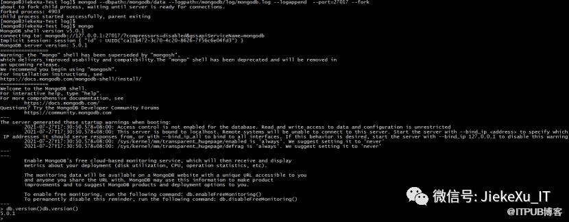 [mongo@JiekeXu-Test ~]$ mongoMongoDB shell version v5.0.1connecting to: mongodb://127.0.0.1:27017/?compressors=disabled&gssapiServiceName=mongodbImplicit session: session { "id" : UUID("00fd0a51-d020-45f5-82d0-c8b6f5bc5f92") }MongoDB server version: 5.0.1================Warning: the "mongo" shell has been superseded by "mongosh",which delivers improved usability and compatibility.The "mongo" shell has been deprecated and will be removed inan upcoming release.We recommend you begin using "mongosh".For installation instructions, seehttps://docs.mongodb.com/mongodb-shell/install/================---The server generated these startup warnings when booting:2021-07-27T17:48:33.189+08:00: Access control is not enabled for the database. Read and write access to data and configuration is unrestricted2021-07-27T17:48:33.189+08:00: This server is bound to localhost. Remote systems will be unable to connect to this server. Start the server with --bind_ip to specify which IP addresses it should serve responses from, or with --bind_ip_all to bind to all interfaces. If this behavior is desired, start the server with --bind_ip 127.0.0.1 to disable this warning------Enable MongoDB's free cloud-based monitoring service, which will then receive and displaymetrics about your deployment (disk utilization, CPU, operation statistics, etc).The monitoring data will be available on a MongoDB website with a unique URL accessible to youand anyone you share the URL with. MongoDB may use this information to make productimprovements and to suggest MongoDB products and deployment options to you.To enable free monitoring, run the following command: db.enableFreeMonitoring()To permanently disable this reminder, run the following command: db.disableFreeMonitoring()---> db.version()5.0.1> quitfunction quit() {[native code]}> exitbye