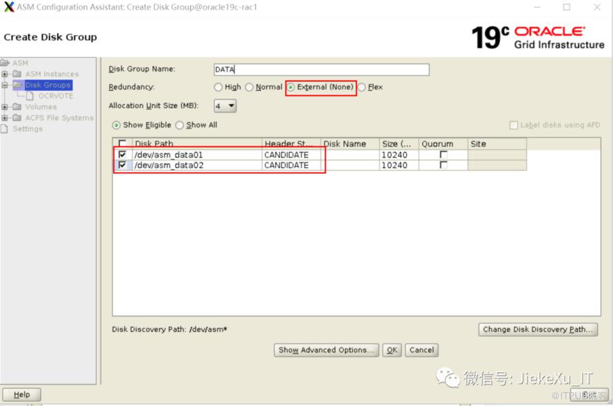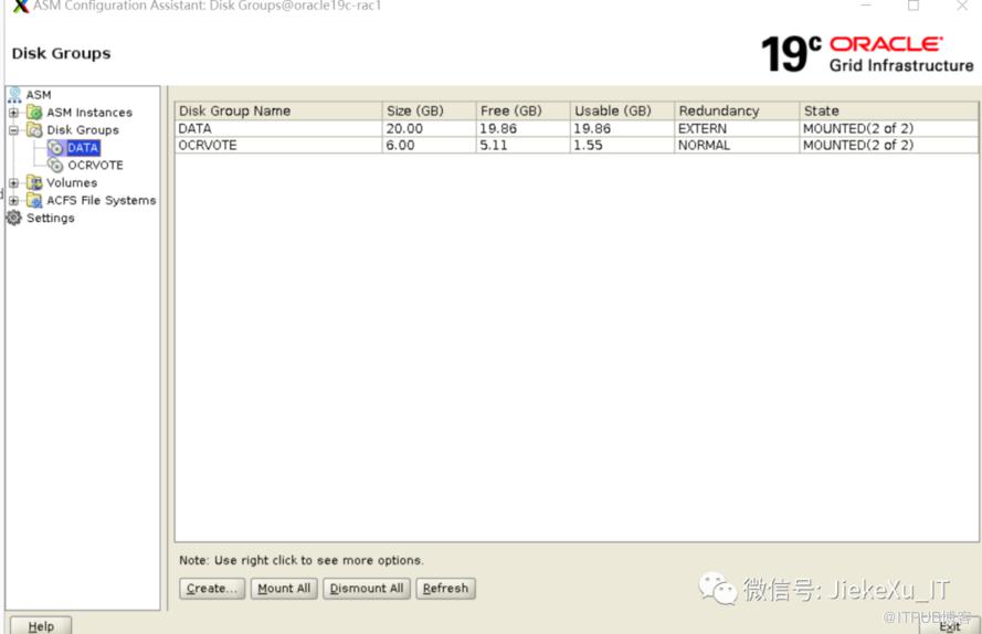 [grid@oracle19c-rac1:/home/grid]$ asmcmdASMCMD> lsdgState Type Rebal Sector Logical_Sector Block AU Total_MB Free_MB Req_mir_free_MB Usable_file_MB Offline_disks Voting_files NameMOUNTED EXTERN N 512 512 4096 4194304 20480 14492 0 14492 0 N DATA/MOUNTED NORMAL N 512 512 4096 4194304 6144 5228 2048 1590 0 Y OCRVOTE/ASMCMD> lsofDB_Name Instance_Name Path+ASM +ASM1 +OCRVOTE.255.1079463727orcl orcl1 +DATA/ORCL/86B637B62FE07A65E053F706E80A27CA/DATAFILE/sysaux.266.1079638609orcl orcl1 +DATA/ORCL/86B637B62FE07A65E053F706E80A27CA/DATAFILE/system.265.1079638609orcl orcl1 +DATA/ORCL/86B637B62FE07A65E053F706E80A27CA/DATAFILE/undotbs1.267.1079638609orcl orcl1 +DATA/ORCL/C8A7183AA0841E82E0538DF5A8C0A5A9/TEMPFILE/temp.268.1079638657orcl orcl1 +DATA/ORCL/C8A90AE7CD0A17B8E0538DF5A8C0C88C/DATAFILE/sysaux.278.1079646975orcl orcl1 +DATA/ORCL/C8A90AE7CD0A17B8E0538DF5A8C0C88C/DATAFILE/system.277.1079646973orcl orcl1 +DATA/ORCL/C8A90AE7CD0A17B8E0538DF5A8C0C88C/DATAFILE/undotbs1.276.1079646973orcl orcl1 +DATA/ORCL/C8A90AE7CD0A17B8E0538DF5A8C0C88C/TEMPFILE/temp.279.1079647223orcl orcl1 +DATA/ORCL/CONTROLFILE/current.261.1079636859orcl orcl1 +DATA/ORCL/DATAFILE/sysaux.258.1079636747orcl orcl1 +DATA/ORCL/DATAFILE/system.257.1079636681orcl orcl1 +DATA/ORCL/DATAFILE/undotbs1.259.1079636773orcl orcl1 +DATA/ORCL/DATAFILE/undotbs2.269.1079639099orcl orcl1 +DATA/ORCL/DATAFILE/users.260.1079636775orcl orcl1 +DATA/ORCL/ONLINELOG/group_1.263.1079636863orcl orcl1 +DATA/ORCL/ONLINELOG/group_2.262.1079636863orcl orcl1 +DATA/ORCL/ONLINELOG/group_3.270.1079640129orcl orcl1 +DATA/ORCL/ONLINELOG/group_4.271.1079640135orcl orcl1 +DATA/ORCL/TEMPFILE/temp.264.1079636895ASMCMD> lsdskPath/dev/asm_data01/dev/asm_data02/dev/asm_ocr01/dev/asm_ocr02/dev/asm_ocr03