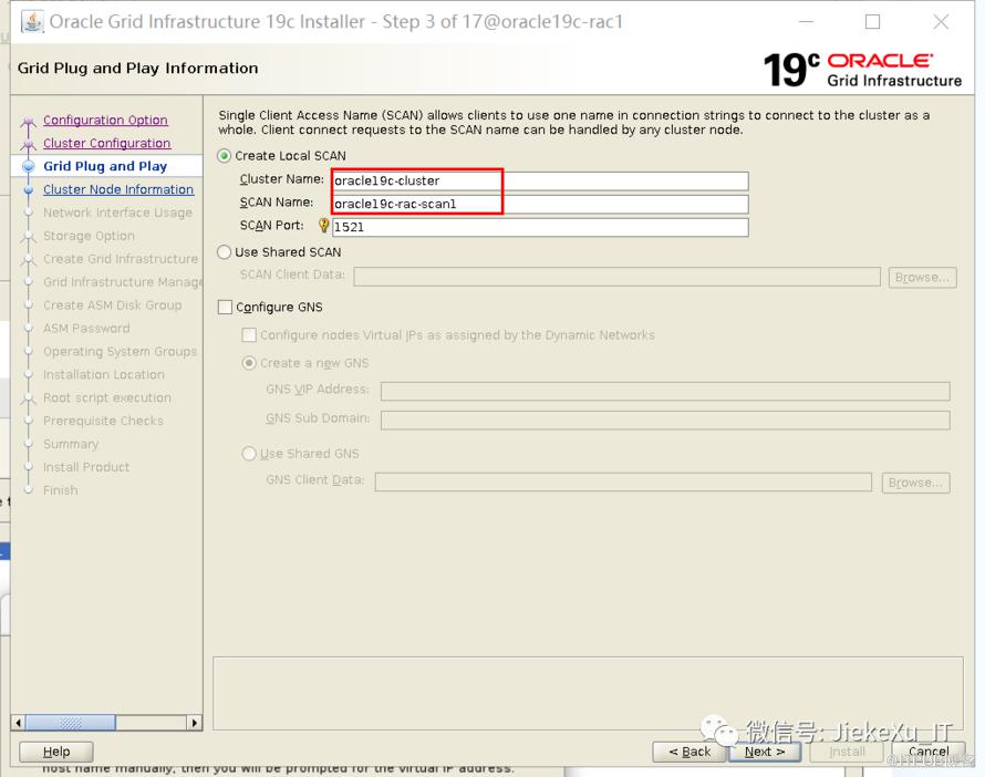 填写集群名称和scan名字,scan名字和/etc/hosts一致