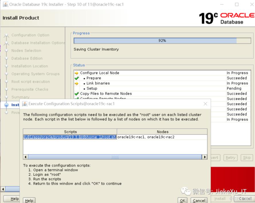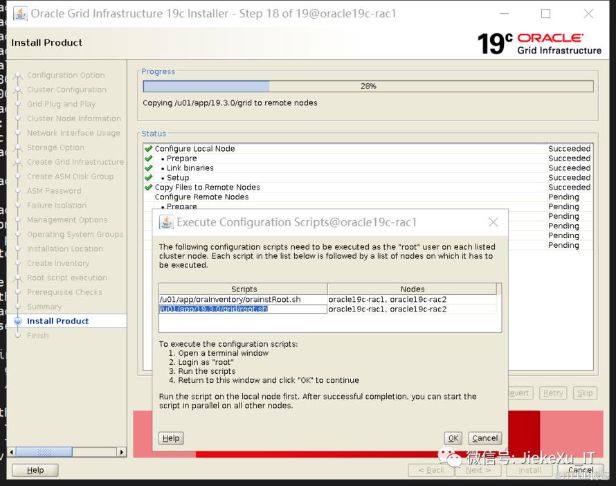 [root@oracle19c-rac1 ~]# /u01/app/oraInventory/orainstRoot.shChanging permissions of /u01/app/oraInventory.Adding read,write permissions for group.Removing read,write,execute permissions for world.Changing groupname of /u01/app/oraInventory to oinstall.The execution of the script is complete.[root@oracle19c-rac2 tmp]# /u01/app/oraInventory/orainstRoot.shChanging permissions of /u01/app/oraInventory.Adding read,write permissions for group.Removing read,write,execute permissions for world.Changing groupname of /u01/app/oraInventory to oinstall.The execution of the script is complete../rootcrs.sh -force -deconfig -verbose[root@oracle19c-rac1 ~]# /u01/app/oraInventory/orainstRoot.shChanging permissions of /u01/app/oraInventory.Adding read,write permissions for group.Removing read,write,execute permissions for world.Changing groupname of /u01/app/oraInventory to oinstall.The execution of the script is complete.[root@oracle19c-rac1 ~]# /u01/app/19.3.0/grid/root.shPerforming root user operation.The following environment variables are set as:ORACLE_OWNER= gridORACLE_HOME= /u01/app/19.3.0/gridEnter the full pathname of the local bin directory: [/usr/local/bin]:Copying dbhome to /usr/local/bin ...Copying oraenv to /usr/local/bin ...Copying coraenv to /usr/local/bin ...Creating /etc/oratab file...Entries will be added to the /etc/oratab file as needed byDatabase Configuration Assistant when a database is createdFinished running generic part of root script.Now product-specific root actions will be performed.Relinking oracle with rac_on optionUsing configuration parameter file: /u01/app/19.3.0/grid/crs/install/crsconfig_paramsThe log of current session can be found at:/u01/app/grid/crsdata/oracle19c-rac1/crsconfig/rootcrs_oracle19c-rac1_2021-08-01_06-54-40PM.log2021/08/01 18:55:00 CLSRSC-594: Executing installation step 1 of 19: 'SetupTFA'.2021/08/01 18:55:00 CLSRSC-594: Executing installation step 2 of 19: 'ValidateEnv'.2021/08/01 18:55:00 CLSRSC-594: Executing installation step 3 of 19: 'CheckFirstNode'.2021/08/01 18:55:03 CLSRSC-594: Executing installation step 4 of 19: 'GenSiteGUIDs'.2021/08/01 18:55:05 CLSRSC-594: Executing installation step 5 of 19: 'SetupOSD'.Redirecting to /bin/systemctl restart rsyslog.service2021/08/01 18:55:07 CLSRSC-594: Executing installation step 6 of 19: 'CheckCRSConfig'.2021/08/01 18:55:11 CLSRSC-594: Executing installation step 7 of 19: 'SetupLocalGPNP'.2021/08/01 18:55:13 CLSRSC-4004: Failed to install Oracle Trace File Analyzer (TFA) Collector. Grid Infrastructure operations will continue.2021/08/01 18:55:25 CLSRSC-594: Executing installation step 8 of 19: 'CreateRootCert'.2021/08/01 18:55:30 CLSRSC-594: Executing installation step 9 of 19: 'ConfigOLR'.2021/08/01 18:55:44 CLSRSC-594: Executing installation step 10 of 19: 'ConfigCHMOS'.2021/08/01 18:55:44 CLSRSC-594: Executing installation step 11 of 19: 'CreateOHASD'.2021/08/01 18:55:52 CLSRSC-594: Executing installation step 12 of 19: 'ConfigOHASD'.2021/08/01 18:55:53 CLSRSC-330: Adding Clusterware entries to file 'oracle-ohasd.service'2021/08/01 18:57:22 CLSRSC-594: Executing installation step 13 of 19: 'InstallAFD'.2021/08/01 18:57:23 CLSRSC-594: Executing installation step 14 of 19: 'InstallACFS'.2021/08/01 18:59:21 CLSRSC-594: Executing installation step 15 of 19: 'InstallKA'.2021/08/01 18:59:29 CLSRSC-594: Executing installation step 16 of 19: 'InitConfig'.ASM has been created and started successfully.[DBT-30001] Disk groups created successfully. Check /u01/app/grid/cfgtoollogs/asmca/asmca-210801PM070008.log for details.2021/08/01 19:02:04 CLSRSC-482: Running command: '/u01/app/19.3.0/grid/bin/ocrconfig -upgrade grid oinstall'CRS-4256: Updating the profileSuccessful addition of voting disk b6fda7690d0e4fcdbfadc303580fb08d.Successful addition of voting disk 8e02bf80da2e4fb8bf50d145561261c9.Successful addition of voting disk bca68836396f4fcdbf307746a22941c5.Successfully replaced voting disk group with +OCRVOTE.CRS-4256: Updating the profileCRS-4266: Voting file(s) successfully replaced## STATE File Universal Id File Name Disk group-- ----- ----------------- --------- ---------1. ONLINE b6fda7690d0e4fcdbfadc303580fb08d (/dev/asm_ocr01) [OCRVOTE]2. ONLINE 8e02bf80da2e4fb8bf50d145561261c9 (/dev/asm_ocr02) [OCRVOTE]3. ONLINE bca68836396f4fcdbf307746a22941c5 (/dev/asm_ocr03) [OCRVOTE]Located 3 voting disk(s).2021/08/01 19:03:33 CLSRSC-594: Executing installation step 17 of 19: 'StartCluster'.2021/08/01 19:04:45 CLSRSC-343: Successfully started Oracle Clusterware stack2021/08/01 19:04:45 CLSRSC-594: Executing installation step 18 of 19: 'ConfigNode'.2021/08/01 19:06:52 CLSRSC-594: Executing installation step 19 of 19: 'PostConfig'.2021/08/01 19:07:37 CLSRSC-325: Configure Oracle Grid Infrastructure for a Cluster ... succeede[root@oracle19c-rac2 ~]# /u01/app/19.3.0/grid/root.shPerforming root user operation.The following environment variables are set as:ORACLE_OWNER= gridORACLE_HOME= /u01/app/19.3.0/gridEnter the full pathname of the local bin directory: [/usr/local/bin]:Copying dbhome to /usr/local/bin ...Copying oraenv to /usr/local/bin ...Copying coraenv to /usr/local/bin ...Creating /etc/oratab file...Entries will be added to the /etc/oratab file as needed byDatabase Configuration Assistant when a database is createdFinished running generic part of root script.Now product-specific root actions will be performed.Relinking oracle with rac_on optionUsing configuration parameter file: /u01/app/19.3.0/grid/crs/install/crsconfig_paramsThe log of current session can be found at:/u01/app/grid/crsdata/oracle19c-rac2/crsconfig/rootcrs_oracle19c-rac2_2021-08-01_07-09-35PM.log2021/08/01 19:10:04 CLSRSC-594: Executing installation step 1 of 19: 'SetupTFA'.2021/08/01 19:10:04 CLSRSC-594: Executing installation step 2 of 19: 'ValidateEnv'.2021/08/01 19:10:04 CLSRSC-594: Executing installation step 3 of 19: 'CheckFirstNode'.2021/08/01 19:10:06 CLSRSC-594: Executing installation step 4 of 19: 'GenSiteGUIDs'.2021/08/01 19:10:06 CLS