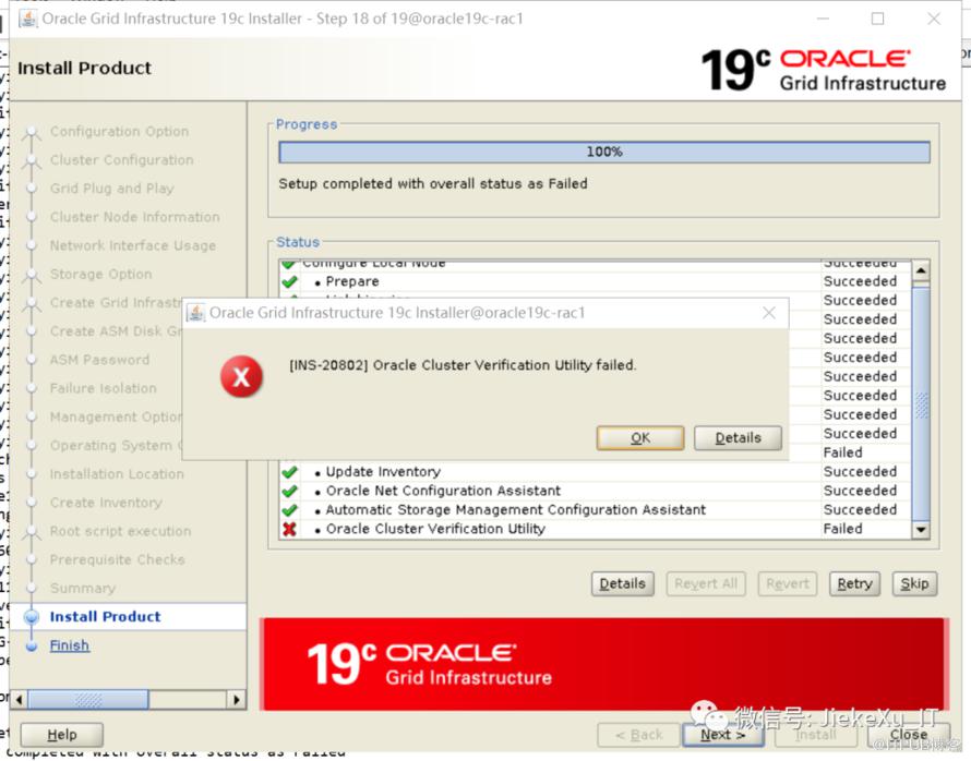 GRID 安装完成,在进行集群校验时,因为 SCAN NAME 没有使用 DNS 解析报失败,此情况正常,忽略