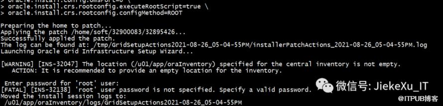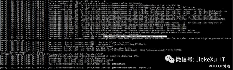 [grid@jiekexu-r2:/home/grid]$ tail -30f /u01/app/19.0.0/grid/install/root_jiekexu-r2_2021-08-31_18-25-18-796337893.logPerforming root user operation.The following environment variables are set as:ORACLE_OWNER= gridORACLE_HOME= /u01/app/19.0.0/gridCopying dbhome to /usr/local/bin ...Copying oraenv to /usr/local/bin ...Copying coraenv to /usr/local/bin ...Entries will be added to the /etc/oratab file as needed byDatabase Configuration Assistant when a database is createdFinished running generic part of root script.Now product-specific root actions will be performed.Relinking oracle with rac_on optionUsing configuration parameter file: /u01/app/19.0.0/grid/crs/install/crsconfig_paramsThe log of current session can be found at:/u01/app/grid/crsdata/jiekexu-r2/crsconfig/rootcrs_jiekexu-r2_2021-08-31_06-25-49PM.log2021/08/31 18:25:53 CLSRSC-594: Executing installation step 1 of 19: 'SetupTFA'.2021/08/31 18:25:53 CLSRSC-594: Executing installation step 2 of 19: 'ValidateEnv'.2021/08/31 18:25:53 CLSRSC-363: User ignored prerequisites during installation2021/08/31 18:25:53 CLSRSC-594: Executing installation step 3 of 19: 'CheckFirstNode'.2021/08/31 18:25:55 CLSRSC-594: Executing installation step 4 of 19: 'GenSiteGUIDs'.2021/08/31 18:25:55 CLSRSC-594: Executing installation step 5 of 19: 'SetupOSD'.Redirecting to /bin/systemctl restart rsyslog.service2021/08/31 18:25:56 CLSRSC-594: Executing installation step 6 of 19: 'CheckCRSConfig'.2021/08/31 18:25:58 CLSRSC-594: Executing installation step 7 of 19: 'SetupLocalGPNP'.2021/08/31 18:26:02 CLSRSC-594: Executing installation step 8 of 19: 'CreateRootCert'.2021/08/31 18:26:02 CLSRSC-594: Executing installation step 9 of 19: 'ConfigOLR'.2021/08/31 18:26:16 CLSRSC-594: Executing installation step 10 of 19: 'ConfigCHMOS'.2021/08/31 18:26:16 CLSRSC-594: Executing installation step 11 of 19: 'CreateOHASD'.2021/08/31 18:26:20 CLSRSC-594: Executing installation step 12 of 19: 'ConfigOHASD'.2021/08/31 18:26:20 CLSRSC-330: Adding Clusterware entries to file 'oracle-ohasd.service'2021/08/31 18:26:43 CLSRSC-594: Executing installation step 13 of 19: 'InstallAFD'.2021/08/31 18:26:43 CLSRSC-594: Executing installation step 14 of 19: 'InstallACFS'.2021/08/31 18:27:30 CLSRSC-594: Executing installation step 15 of 19: 'InstallKA'.2021/08/31 18:27:33 CLSRSC-594: Executing installation step 16 of 19: 'InitConfig'.2021/08/31 18:27:42 CLSRSC-594: Executing installation step 17 of 19: 'StartCluster'.2021/08/31 18:27:56 CLSRSC-4002: Successfully installed Oracle Trace File Analyzer (TFA) Collector.2021/08/31 18:28:28 CLSRSC-343: Successfully started Oracle Clusterware stack2021/08/31 18:28:29 CLSRSC-594: Executing installation step 18 of 19: 'ConfigNode'.2021/08/31 18:29:13 CLSRSC-594: Executing installation step 19 of 19: 'PostConfig'.2021/08/31 18:29:19 CLSRSC-325: Configure Oracle Grid Infrastructure for a Cluster ... succeeded