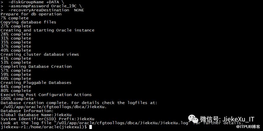 dbca -silent -createDatabase \ -templateName General_Purpose.dbc \ -gdbname JiekeXu -responseFile NO_VALUE \ -characterSet AL32UTF8 \ -sysPassword Oracle19c \ -systemPassword Oracle19c \ -createAsContainerDatabase false \ -databaseType MULTIPURPOSE \ -automaticMemoryManagement false \ -totalMemory 8192 \ -redoLogFileSize 1024 \ -emConfiguration NONE \ -ignorePreReqs \ -nodelist jiekexu-r1,jiekexu-r2 \ -storageType ASM \ -diskGroupName +DATA \ -asmsnmpPassword Oracle19c \ -recoveryAreaDestination NONE