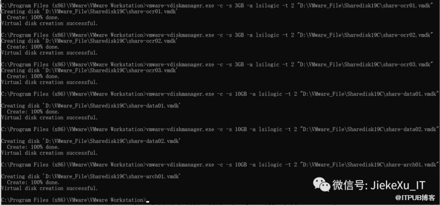 vmware-vdiskmanager.exe -c -s 3GB -a lsilogic -t 2 "D:\VMware_File\Sharedisk19C\share-ocr01.vmdk" vmware-vdiskmanager.exe -c -s 3GB -a lsilogic -t 2 "D:\VMware_File\Sharedisk19C\share-ocr02.vmdk" vmware-vdiskmanager.exe -c -s 3GB -a lsilogic -t 2 "D:\VMware_File\Sharedisk19C\share-ocr03.vmdk" vmware-vdiskmanager.exe -c -s 10GB -a lsilogic -t 2 "D:\VMware_File\Sharedisk19C\share-data01.vmdk"vmware-vdiskmanager.exe -c -s 10GB -a lsilogic -t 2 "D:\VMware_File\Sharedisk19C\share-data02.vmdk"vmware-vdiskmanager.exe -c -s 10GB -a lsilogic -t 2 "D:\VMware_File\Sharedisk19C\share-arch01.vmdk"