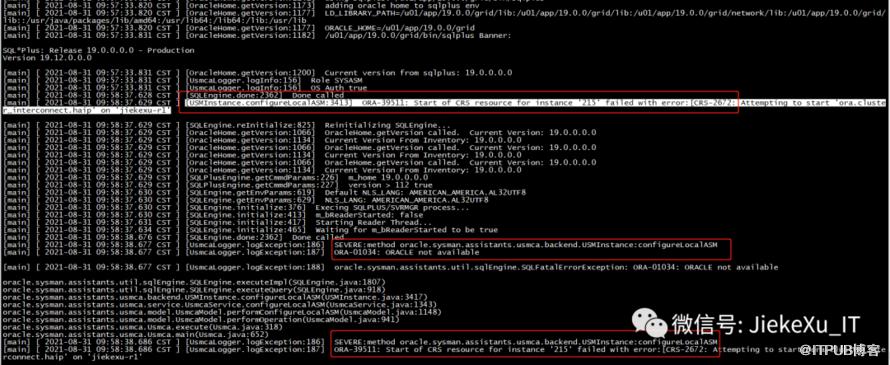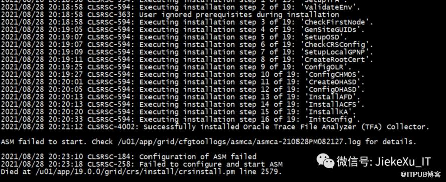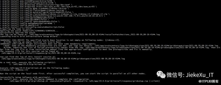 /u01/app/19.0.0/grid/gridSetup.sh -silent -executeConfigTools -waitforcompletion \-responseFile /u01/app/19.0.0/grid/install/response/gridsetup.rsp \INVENTORY_LOCATION=/u01/app/oraInventory \ORACLE_BASE=/u01/app/grid \ORACLE_HOME=/u01/app/19.0.0/grid \oracle.install.asm.OSDBA=asmdba \oracle.install.asm.OSOPER=asmoper \oracle.install.asm.OSASM=asmadmin \oracle.install.crs.config.storageOption=ASM \oracle.install.crs.config.useIPMI=false \oracle.install.asm.diskGroup.name=OCR \oracle.install.asm.diskGroup.AUSize=4 \oracle.install.asm.diskGroup.redundancy=NORMAL \oracle.install.crs.config.ClusterConfiguration=STANDALONE \oracle.install.crs.config.configureAsExtendedCluster=false \oracle.install.crs.config.gpnp.scanPort=1521 \oracle.install.crs.config.gpnp.configureGNS=false \oracle.install.option=CRS_CONFIG \oracle.install.asm.SYSASMPassword=Oracle19C \oracle.install.asm.monitorPassword=Oracle19C \oracle.install.asm.diskGroup.diskDiscoveryString=/dev/asm_* \oracle.install.asm.diskGroup.disks=/dev/asm_ocr01,/dev/asm_ocr02,/dev/asm_ocr03 \oracle.install.crs.config.gpnp.scanName=jiekexu-racscan \oracle.install.crs.config.clusterName=jiekexu-racscan \oracle.install.crs.config.autoConfigureClusterNodeVIP=false \oracle.install.crs.config.clusterNodes=jiekexu-r1:jiekexu-r1-vip,jiekexu-r2:jiekexu-r2-vip \oracle.install.crs.config.networkInterfaceList=ens32:192.168.75.0:1,ens33:10.10.10.0:5 \oracle.install.asm.configureGIMRDataDG=false \oracle.install.crs.configureRHPS=false \oracle.install.crs.config.ignoreDownNodes=false \oracle.install.config.managementOption=NONE \oracle.install.config.omsPort=0 \oracle.install.crs.rootconfig.executeRootScript=falseLaunching Oracle Grid Infrastructure Setup Wizard...You can find the logs of this session at:/u01/app/oraInventory/logs/GridSetupActions2021-08-31_06-44-55PMYou can find the log of this install session at:/u01/app/oraInventory/logs/UpdateNodeList2021-08-31_06-44-55PM.logConfiguration failed.[WARNING] [INS-43080] Some of the configuration assistants failed, were cancelled or skipped.ACTION: Refer to the logs or contact Oracle Support Services.