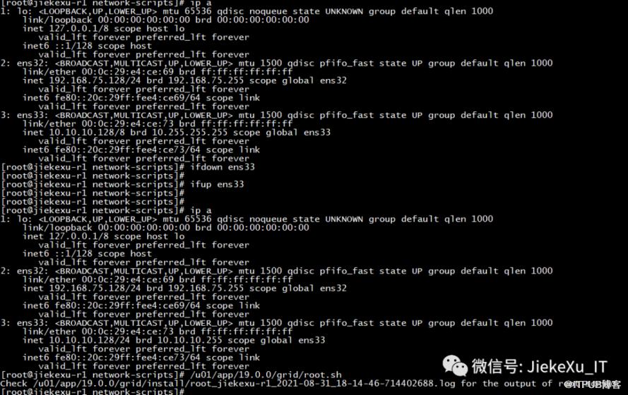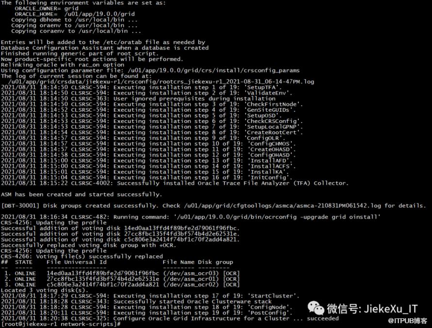 [root@jiekexu-r1 network-scripts]# cat /u01/app/19.0.0/grid/install/root_jiekexu-r1_2021-08-31_18-14-46-714402688.logPerforming root user operation.The following environment variables are set as:ORACLE_OWNER= gridORACLE_HOME= /u01/app/19.0.0/gridCopying dbhome to /usr/local/bin ...Copying oraenv to /usr/local/bin ...Copying coraenv to /usr/local/bin ...Entries will be added to the /etc/oratab file as needed byDatabase Configuration Assistant when a database is createdFinished running generic part of root script.Now product-specific root actions will be performed.Relinking oracle with rac_on optionUsing configuration parameter file: /u01/app/19.0.0/grid/crs/install/crsconfig_paramsThe log of current session can be found at:/u01/app/grid/crsdata/jiekexu-r1/crsconfig/rootcrs_jiekexu-r1_2021-08-31_06-14-47PM.log2021/08/31 18:14:50 CLSRSC-594: Executing installation step 1 of 19: 'SetupTFA'.2021/08/31 18:14:50 CLSRSC-594: Executing installation step 2 of 19: 'ValidateEnv'.2021/08/31 18:14:50 CLSRSC-363: User ignored prerequisites during installation2021/08/31 18:14:50 CLSRSC-594: Executing installation step 3 of 19: 'CheckFirstNode'.2021/08/31 18:14:52 CLSRSC-594: Executing installation step 4 of 19: 'GenSiteGUIDs'.2021/08/31 18:14:53 CLSRSC-594: Executing installation step 5 of 19: 'SetupOSD'.2021/08/31 18:14:53 CLSRSC-594: Executing installation step 6 of 19: 'CheckCRSConfig'.2021/08/31 18:14:53 CLSRSC-594: Executing installation step 7 of 19: 'SetupLocalGPNP'.2021/08/31 18:14:54 CLSRSC-594: Executing installation step 8 of 19: 'CreateRootCert'.2021/08/31 18:14:57 CLSRSC-594: Executing installation step 9 of 19: 'ConfigOLR'.2021/08/31 18:14:57 CLSRSC-594: Executing installation step 10 of 19: 'ConfigCHMOS'.2021/08/31 18:14:57 CLSRSC-594: Executing installation step 11 of 19: 'CreateOHASD'.2021/08/31 18:14:58 CLSRSC-594: Executing installation step 12 of 19: 'ConfigOHASD'.2021/08/31 18:15:00 CLSRSC-594: Executing installation step 13 of 19: 'InstallAFD'.2021/08/31 18:15:00 CLSRSC-594: Executing installation step 14 of 19: 'InstallACFS'.2021/08/31 18:15:01 CLSRSC-594: Executing installation step 15 of 19: 'InstallKA'.2021/08/31 18:15:04 CLSRSC-594: Executing installation step 16 of 19: 'InitConfig'.2021/08/31 18:15:22 CLSRSC-4002: Successfully installed Oracle Trace File Analyzer (TFA) Collector.ASM has been created and started successfully.[DBT-30001] Disk groups created successfully. Check /u01/app/grid/cfgtoollogs/asmca/asmca-210831PM061542.log for details.2021/08/31 18:16:34 CLSRSC-482: Running command: '/u01/app/19.0.0/grid/bin/ocrconfig -upgrade grid oinstall'CRS-4256: Updating the profileSuccessful addition of voting disk 14ed0aa13ffd4f89bfe2d79061f96fbc.Successful addition of voting disk 27cc8fbc135f4fd3bf574b4d2e62531e.Successful addition of voting disk c5c806e3a2414f74bf1c70f2add4a821.Successfully replaced voting disk group with +OCR.CRS-4256: Updating the profileCRS-4266: Voting file(s) successfully replacedSTATE File Universal Id File Name Disk group-- ----- ----------------- --------- ---------1. ONLINE 14ed0aa13ffd4f89bfe2d79061f96fbc (/dev/asm_ocr03) [OCR]2. ONLINE 27cc8fbc135f4fd3bf574b4d2e62531e (/dev/asm_ocr01) [OCR]3. ONLINE c5c806e3a2414f74bf1c70f2add4a821 (/dev/asm_ocr02) [OCR]Located 3 voting disk(s).2021/08/31 18:17:29 CLSRSC-594: Executing installation step 17 of 19: 'StartCluster'.2021/08/31 18:18:28 CLSRSC-343: Successfully started Oracle Clusterware stack2021/08/31 18:18:28 CLSRSC-594: Executing installation step 18 of 19: 'ConfigNode'.2021/08/31 18:20:11 CLSRSC-594: Executing installation step 19 of 19: 'PostConfig'.2021/08/31 18:20:38 CLSRSC-325: Configure Oracle Grid Infrastructure for a Cluster ... succeeded