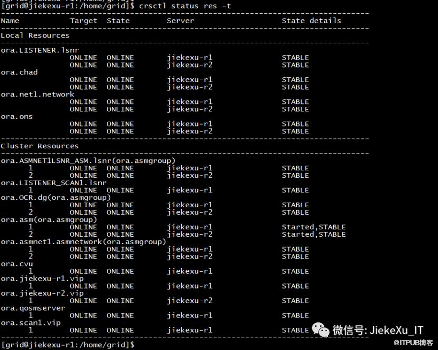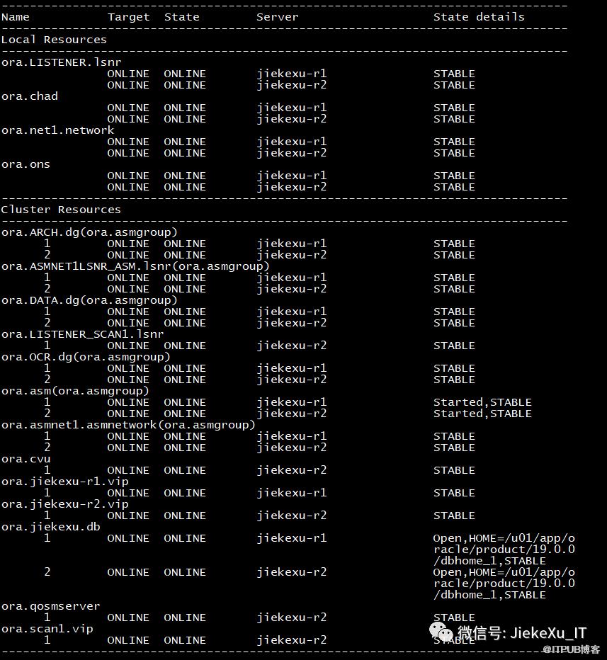 jiekexu-r1:/home/grid(+ASM1)$ crsctl status res -tName Target State Server State detailsLocal Resourcesora.LISTENER.lsnrONLINE ONLINE jiekexu-r1 STABLEONLINE ONLINE jiekexu-r2 STABLEora.chadONLINE ONLINE jiekexu-r1 STABLEONLINE ONLINE jiekexu-r2 STABLEora.net1.networkONLINE ONLINE jiekexu-r1 STABLEONLINE ONLINE jiekexu-r2 STABLEora.onsONLINE ONLINE jiekexu-r1 STABLEONLINE ONLINE jiekexu-r2 STABLECluster Resourcesora.ARCH.dg(ora.asmgroup)1 ONLINE ONLINE jiekexu-r1 STABLE2 ONLINE ONLINE jiekexu-r2 STABLEora.ASMNET1LSNR_ASM.lsnr(ora.asmgroup)1 ONLINE ONLINE jiekexu-r1 STABLE2 ONLINE ONLINE jiekexu-r2 STABLEora.DATA.dg(ora.asmgroup)1 ONLINE ONLINE jiekexu-r1 STABLE2 ONLINE ONLINE jiekexu-r2 STABLEora.LISTENER_SCAN1.lsnr1 ONLINE ONLINE jiekexu-r2 STABLEora.OCR.dg(ora.asmgroup)1 ONLINE ONLINE jiekexu-r1 STABLE2 ONLINE ONLINE jiekexu-r2 STABLEora.asm(ora.asmgroup)1 ONLINE ONLINE jiekexu-r1 Started,STABLE2 ONLINE ONLINE jiekexu-r2 Started,STABLEora.asmnet1.asmnetwork(ora.asmgroup)1 ONLINE ONLINE jiekexu-r1 STABLE2 ONLINE ONLINE jiekexu-r2 STABLEora.cvu1 ONLINE ONLINE jiekexu-r2 STABLEora.jiekexu-r1.vip1 ONLINE ONLINE jiekexu-r1 STABLEora.jiekexu-r2.vip1 ONLINE ONLINE jiekexu-r2 STABLEora.jiekexu.db1 ONLINE ONLINE jiekexu-r1 Open,HOME=/u01/app/oracle/product/19.0.0/dbhome_1,STABLE2 ONLINE ONLINE jiekexu-r2 Open,HOME=/u01/app/oracle/product/19.0.0/dbhome_1,STABLEora.qosmserver1 ONLINE ONLINE jiekexu-r2 STABLEora.scan1.vip1 ONLINE ONLINE jiekexu-r2 STABLEjiekexu-r1:/home/grid(+ASM1)$
