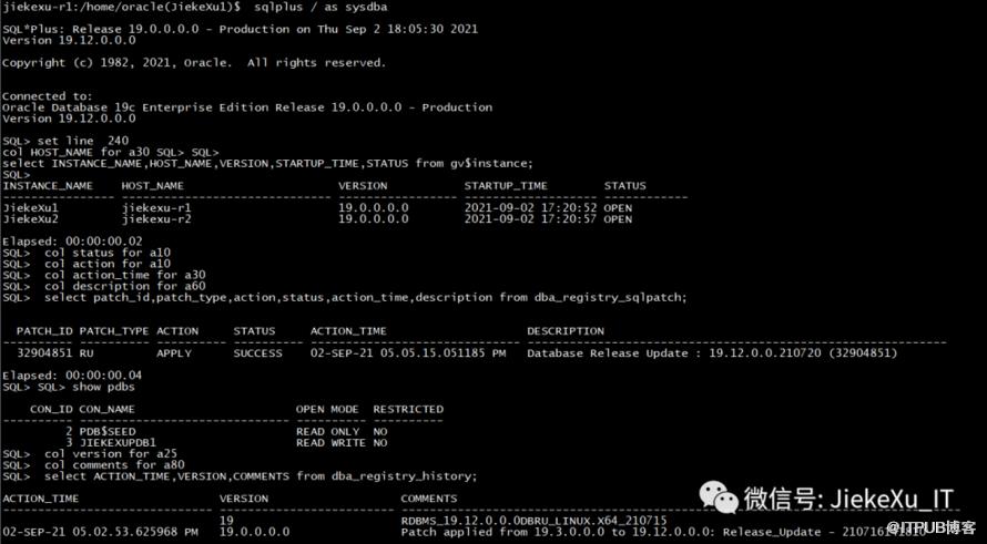 jiekexu-r1:/home/oracle(JiekeXu1)$ sqlplus / as sysdbaSQL*Plus: Release 19.0.0.0.0 - Production on Thu Sep 2 18:05:30 2021Version 19.12.0.0.0Copyright (c) 1982, 2021, Oracle. All rights reserved.Connected to:Oracle Database 19c Enterprise Edition Release 19.0.0.0.0 - ProductionVersion 19.12.0.0.0SQL> set line 240col HOST_NAME for a30 SQL> SQL>select INSTANCE_NAME,HOST_NAME,VERSION,STARTUP_TIME,STATUS from gv$instance;SQL>INSTANCE_NAME HOST_NAME VERSION STARTUP_TIME STATUS---------------- ------------------------------ ----------------- ------------------- ------------JiekeXu1 jiekexu-r1 19.0.0.0.0 2021-09-02 17:20:52 OPENJiekeXu2 jiekexu-r2 19.0.0.0.0 2021-09-02 17:20:57 OPENElapsed: 00:00:00.02SQL> col status for a10SQL> col action for a10SQL> col action_time for a30SQL> col description for a60SQL> select patch_id,patch_type,action,status,action_time,description from dba_registry_sqlpatch;PATCH_ID PATCH_TYPE ACTION STATUS ACTION_TIME DESCRIPTION---------- ---------- ---------- ---------- ------------------------------ ------------------------------------------------------------32904851 RU APPLY SUCCESS 02-SEP-21 05.05.15.051185 PM Database Release Update : 19.12.0.0.210720 (32904851)SQL> SQL> show pdbsCON_ID CON_NAME OPEN MODE RESTRICTED---------- ------------------------------ ---------- ----------2 PDB$SEED READ ONLY NO3 JIEKEXUPDB1 READ WRITE NOSQL> col version for a25SQL> col comments for a80SQL> select ACTION_TIME,VERSION,COMMENTS from dba_registry_history;ACTION_TIME VERSION COMMENTS------------------------------ ------------------------- --------------------------------------------------------------------------------19 RDBMS_19.12.0.0.0DBRU_LINUX.X64_21071502-SEP-21 05.02.53.625968 PM 19.0.0.0.0 Patch applied from 19.3.0.0.0 to 19.12.0.0.0: Release_Update - 210716141810
