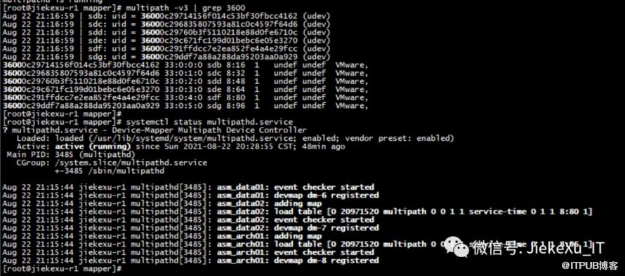 [root@jiekexu-r1 ~]# systemctl status oracle-ohasd.service? oracle-ohasd.service - Oracle High Availability ServicesLoaded: loaded (/etc/systemd/system/oracle-ohasd.service; enabled; vendor preset: disabled)Drop-In: /etc/systemd/system/oracle-ohasd.service.d+-00_oracle-ohasd.confActive: active (running) since Thu 2021-09-02 10:55:47 CST; 37min agoMain PID: 1638 (init.ohasd)CGroup: /system.slice/oracle-ohasd.service+- 1638 /bin/sh /etc/init.d/init.ohasd run >/dev/null 2>&1…………省略更多输出…………Sep 02 11:29:49 jiekexu-r1 CLSD[4579]: The clock on host jiekexu-r1 has been updated by the Cluster Time Synchronization Service to be synchronous with the mean cluster time.Sep 02 11:31:58 jiekexu-r1 oracle_26819_+a[26819]: Oracle Audit[26819]: LENGTH : '247' ACTION :[7] 'CONNECT' DATABASE USER:[1] '/' PRIVILEGE :[6] 'SYSDBA' CLIENT USER:[4] 'gri...R:[3] '100'Hint: Some lines were ellipsized, use -l to show in full.