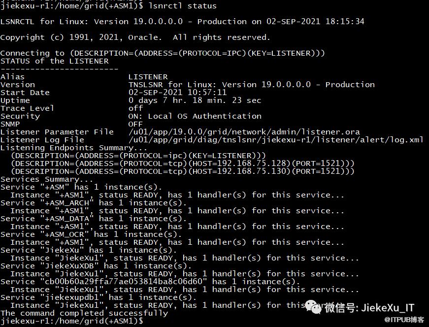 [root@jiekexu-r1 ~]# /u01/app/19.0.0/grid/root.shCheck /u01/app/19.0.0/grid/install/root_jiekexu-r1_2021-08-28_19-52-00-806173517.log for the output of root script[root@jiekexu-r1 ~]#