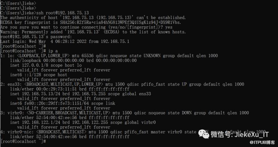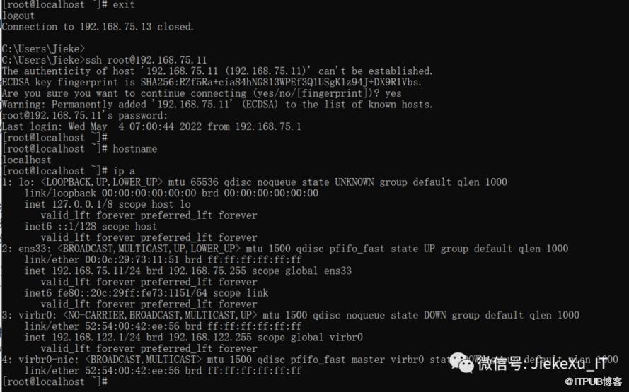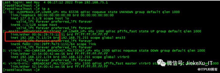 [root@localhost network-scripts]# ip a1: lo:mtu 65536 qdisc noqueue state UNKNOWN group default qlen 1000 link/loopback 00:00:00:00:00:00 brd 00:00:00:00:00:00 inet 127.0.0.1/8 scope host lo valid_lft forever preferred_lft forever inet6 ::1/128 scope host valid_lft forever preferred_lft forever2: ens33: mtu 1500 qdisc pfifo_fast state UP group default qlen 1000 link/ether 00:0c:29:73:11:51 brd ff:ff:ff:ff:ff:ff inet 192.168.75.11/24 brd 192.168.75.255 scope global ens33 valid_lft forever preferred_lft forever inet6 fe80::20c:29ff:fe73:1151/64 scope link valid_lft forever preferred_lft forever3: virbr0: mtu 1500 qdisc noqueue state DOWN group default qlen 1000 link/ether 52:54:00:42:ee:56 brd ff:ff:ff:ff:ff:ff inet 192.168.122.1/24 brd 192.168.122.255 scope global virbr0 valid_lft forever preferred_lft forever4: virbr0-nic: mtu 1500 qdisc pfifo_fast master virbr0 state DOWN group default qlen 1000 link/ether 52:54:00:42:ee:56 brd ff:ff:ff:ff:ff:ff