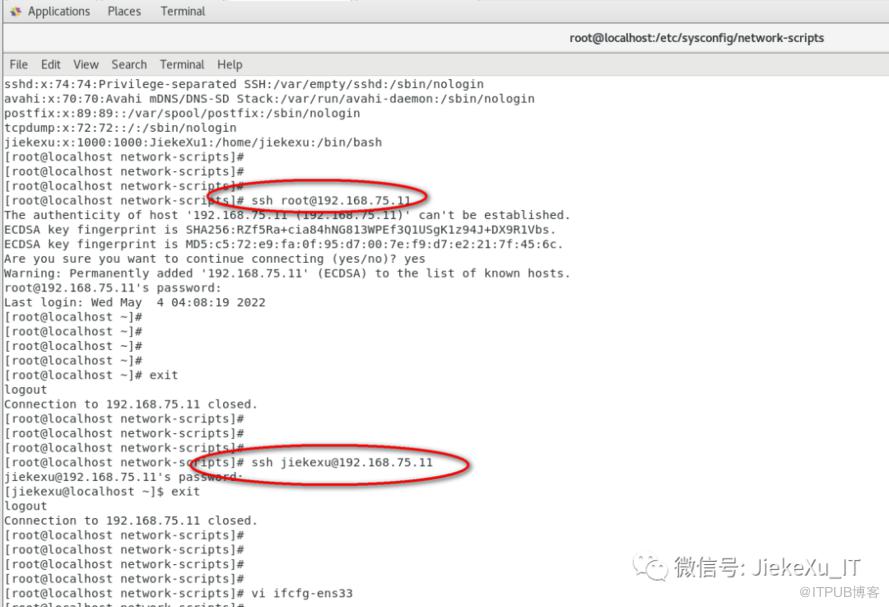 [root@localhost ~]# cd /etc/sysconfig/network-scripts/[root@localhost network-scripts]# more ifcfg-ens33 TYPE="Ethernet"PROXY_METHOD="none"BROWSER_ONLY="no"BOOTPROTO="static"DEFROUTE="yes"IPV4_FAILURE_FATAL="no"IPV6INIT="no"NAME="ens33"UUID="12550792-de37-403c-b072-7e9e81c7f97b"DEVICE="ens33"ONBOOT="yes"USERCTL=noIPADDR=192.168.75.11GATEWAY=192.168.75.2NETMASK=255.255.255.0DNS1=114.114.114.114DNS2=8.8.8.8NM_CONTROLLED="no"