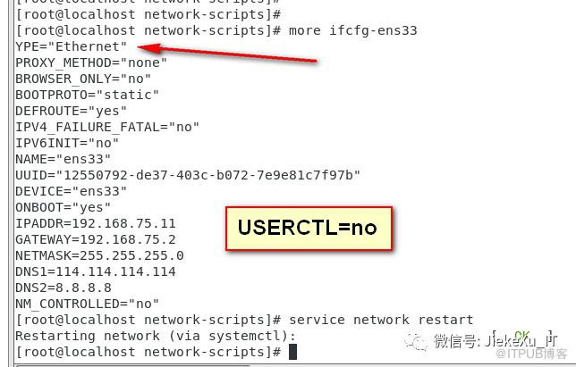 [root@localhost network-scripts]# more /etc/sysconfig/network-scripts/ifcfg-ens33 TYPE="Ethernet"PROXY_METHOD="none"BROWSER_ONLY="no"BOOTPROTO="static"DEFROUTE="yes"IPV4_FAILURE_FATAL="no"IPV6INIT="no"NAME="ens33"UUID="12550792-de37-403c-b072-7e9e81c7f97b"DEVICE="ens33"ONBOOT="yes"USERCTL=noIPADDR=192.168.75.13GATEWAY=192.168.75.2NETMASK=255.255.255.0DNS1=114.114.114.114DNS2=8.8.8.8NM_CONTROLLED="no"[root@localhost network-scripts]# [root@localhost network-scripts]# service network restartRestarting network (via systemctl): [ OK ]