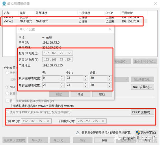 的网络配置,然后 VM 里选择【编辑】——>【虚拟网络编辑器】——>【DHCP设置】,子网 IP