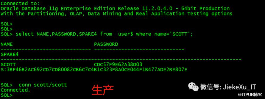 SQL> select NAME,PASSWORD,SPARE4 from user$ where name='SCOTT';NAME PASSWORD------------------------------ ------------------------------SPARE4--------------------------------------------------------------------------------SCOTT CDC57F9E62A38D03S:3BF46B2AC692CD7CD80082CB6C7C4B1C323F8A0CE044F1B477ADE2BE807Ealter user scott identified by values 'S:3BF46B2AC692CD7CD80082CB6C7C4B1C323F8A0CE044F1B477ADE2BE807E';或者alter user scott identified by values 'CDC57F9E62A38D03';