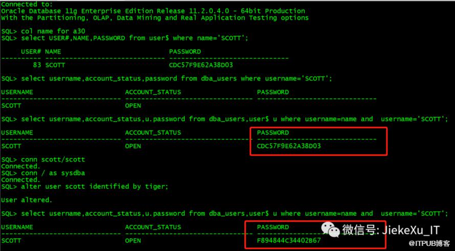 现在将新改为 tiger 的 Scott 用户密码过期,然后我们通过 user$ 的 password 字段值来修改一下密码。